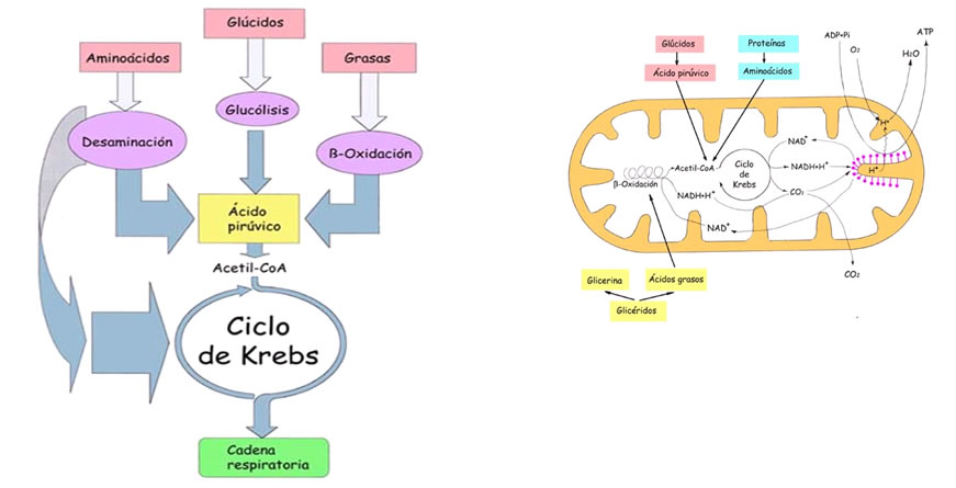 2.Lípidos: Los ácidos grasos se unen a la coenzima A y forman Acil-CoAel cual luego puede pasar a la beta oxidación en la cual tras liberación sucesiva de átomos de carbono se produce FADH2 y NADH (que se luego son oxidados en la cadena respiratoria) y acetil-CoA que es sustrato para el ciclo de Krebs.